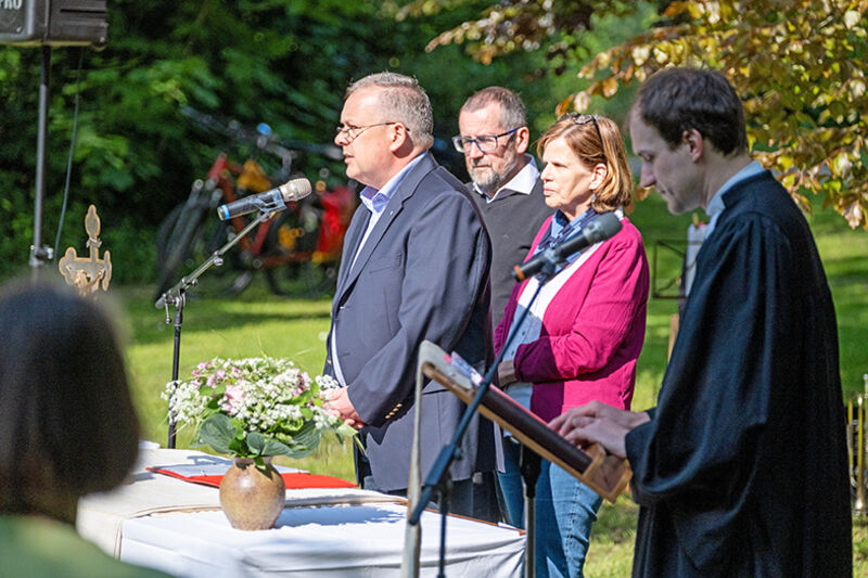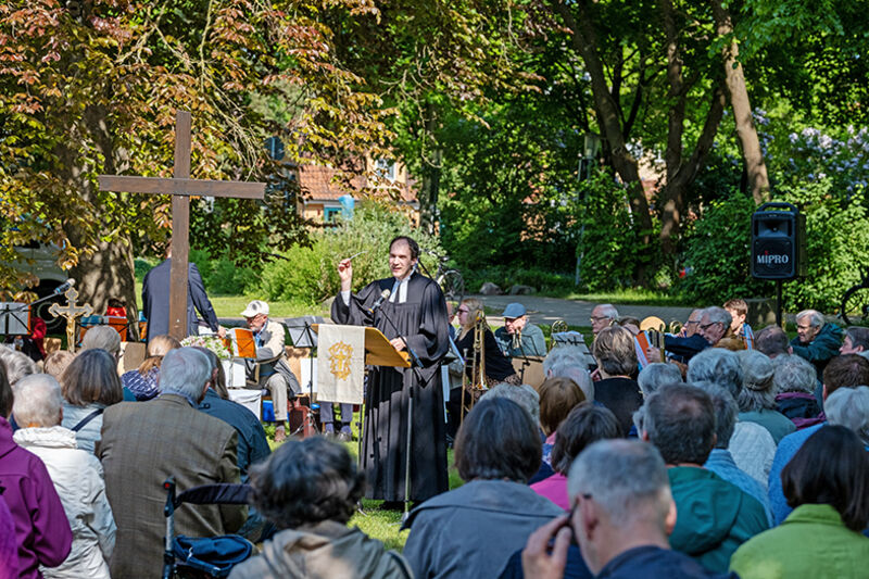 Rund 150 Gäste nahmen an dem Gottesdienst unter blauem Himmel teil. Die Predigt von Superintendentin Sabine Preuschoff dokumentieren wir hier in voller Länge (siehe unten). Pastor Henrik Heinicke leitete durch den Gottesdienst. Der Posaunenchor der Kirchengemeinde unter der Leitung von Martin Burzeya-Wille war für die Musik verantwortlich.